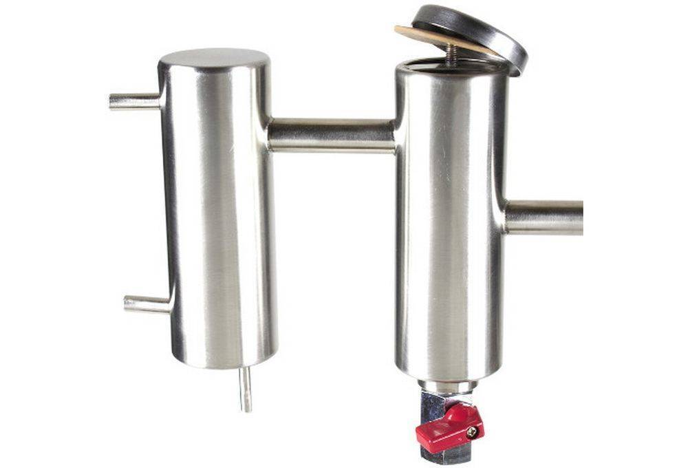 - Дефлегматор устанавливают в конце паропровода. В дефлегматоре происходит дополнительное охлаждение паров что улучшает отделение фракций. Здесь происходит конденсация вредных примесей. Слив фракции происходит через специальное отверстие в сухопарнике. А первично очищенные пары продолжают свое движение далее по конструкции самогонного аппарата.