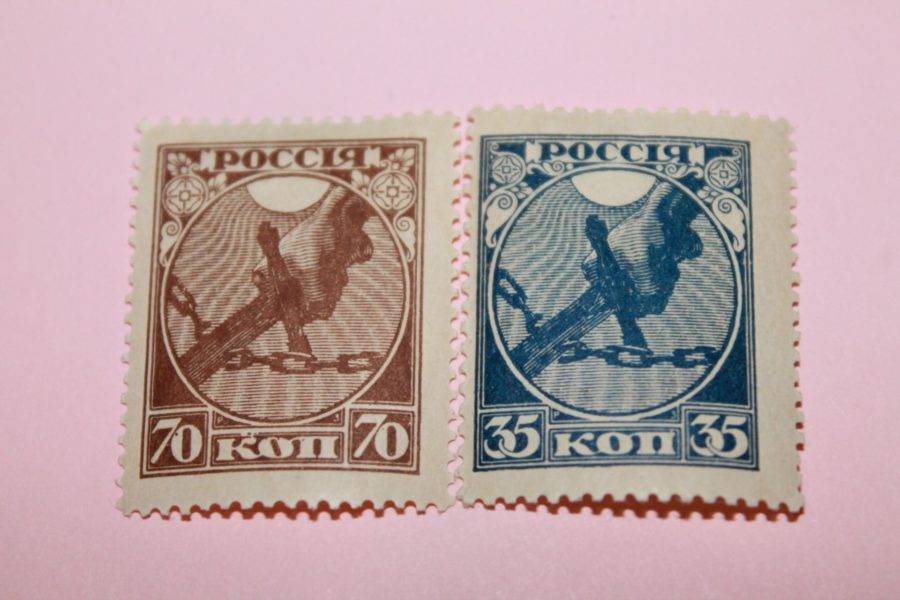 Самая первая марка Советской России. Выпуск был заказан Временным правительством, но она поступила в продажу уже после революции. Напечатано два номинала этих знаков оплаты: по 35 и 70 копеек.