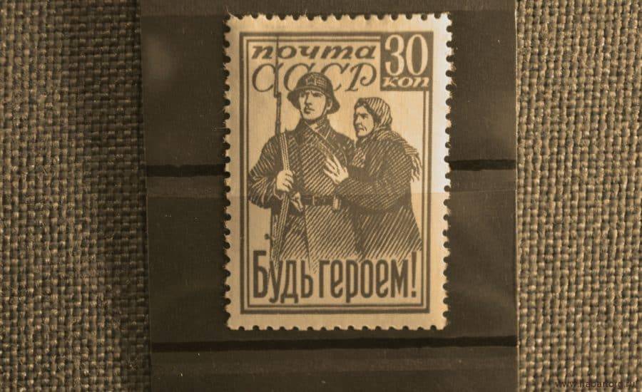 Напечатана в начале Великой Отечественной войны, почти весь тираж сгорел при бомбежке. На марке воспроизведен фотоплакат В. Корецкого, номинал ее − 30 копеек.