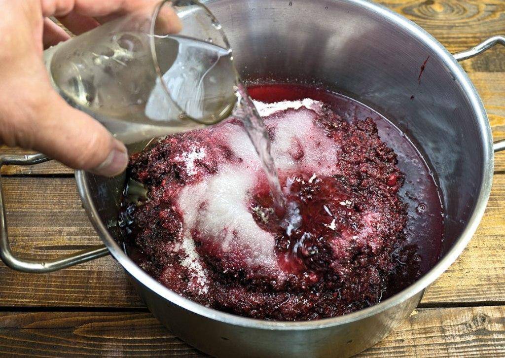На 1 кг виноградного жмыха (включая ветки) берут 500 г сахара и 3 л воды. Ежедневно перемешивают получившуюся в процессе брожения шапку. Брожение длится 2-4 недели. Чтобы определить момент завершения брожения, следят за выделением газа. Полностью перебродивший продукт его уже не вырабатывает.