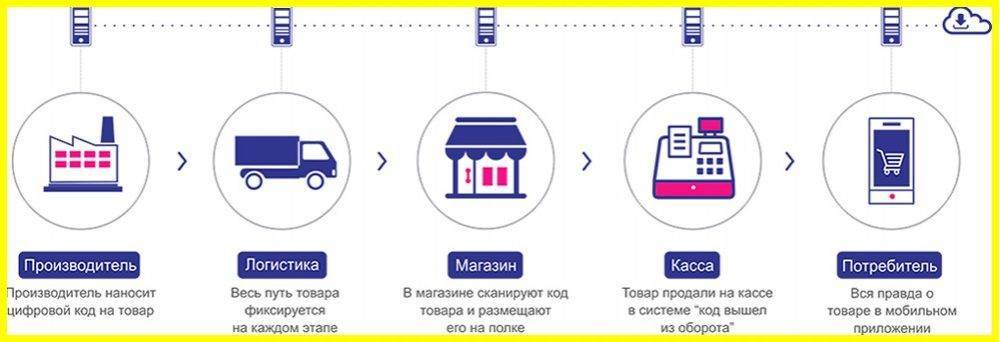 - Коды маркировки выдаются системой производителю, и наносятся на товар. Каждой пачке сигарет присваивается уникальный номер и данные передаются в «Честный ЗНАК». С этого момента система знает, что этот товар введён в оборот.