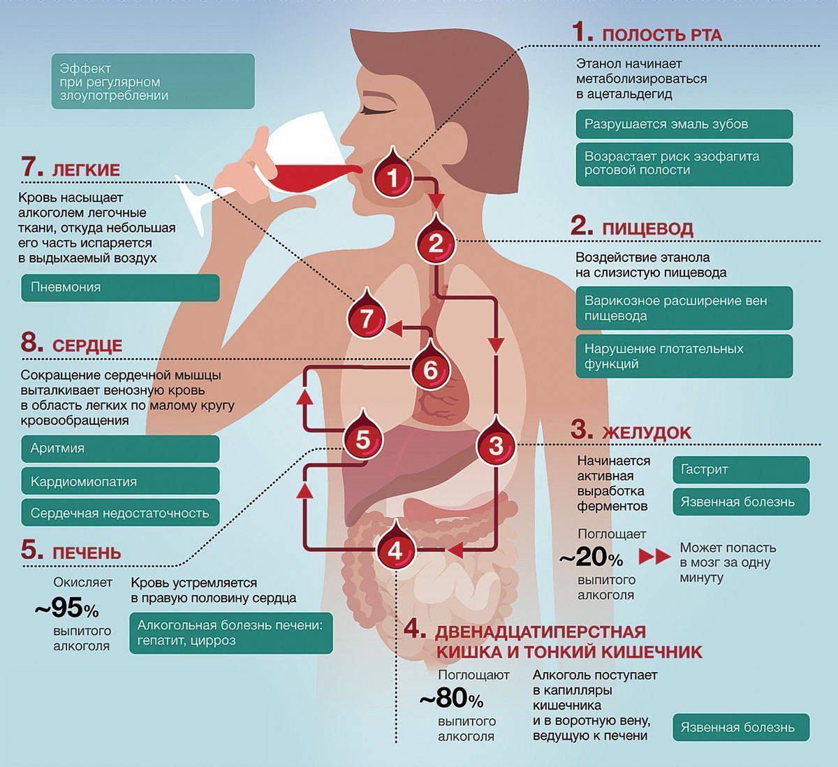 По данным Роспотребнадзора алкоголь вызывает чувство эйфории, тем самым маскируя волнение и беспокойство. Именно этим он привлекателен для организма. Но это средство не оправдывает последствия. Ухудшается зрение и половая активность. Когда развивается алкогольная зависимость, человек не может нормально жить. Поражение печени приводит к различным ее болезням. Даже если человек отказывается от употребления спиртного, организм придет в норму не скоро.
