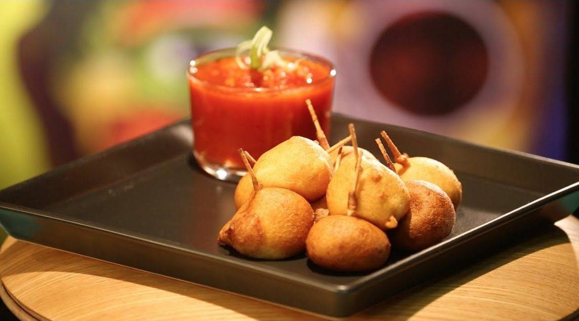 - Опустить во фритюр. Погружать по одному кусочку. Нельзя отпускать зубочистку сразу. Кляр прилипнет к дну сковороды или фритюрнице, и достать готовую закуску будет сложно. Он должен схватиться.