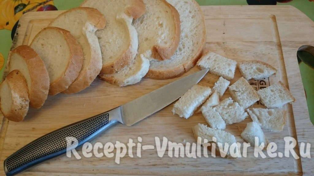 Хлеб нарезаем тоненькими брусочками шириной около сантиметра. Тоньше не стоит – иначе в мультиварке получатся хлебные крошки вместо аккуратных брусочков.