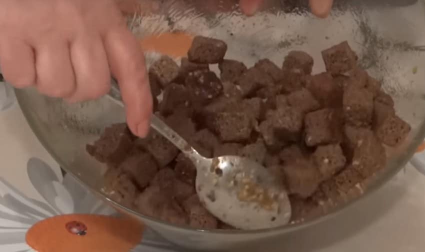 - Порезанные кусочки хлеба перемешать с чесночно-масляной смесью, оставить на пару минут, чтобы они успели впитать заправку.