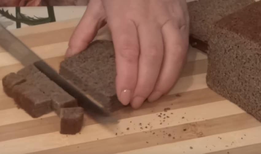 - Лучше для закуски использовать вчерашний, слегка подсушенный хлеб. Он будет меньше крошиться в процессе обработки и проще резаться. Если такого нет, можно пойти на хитрость. Положите буханку свежего хлеба в холодильник no-frost. За пару часов он обветрится до нужного состояния.