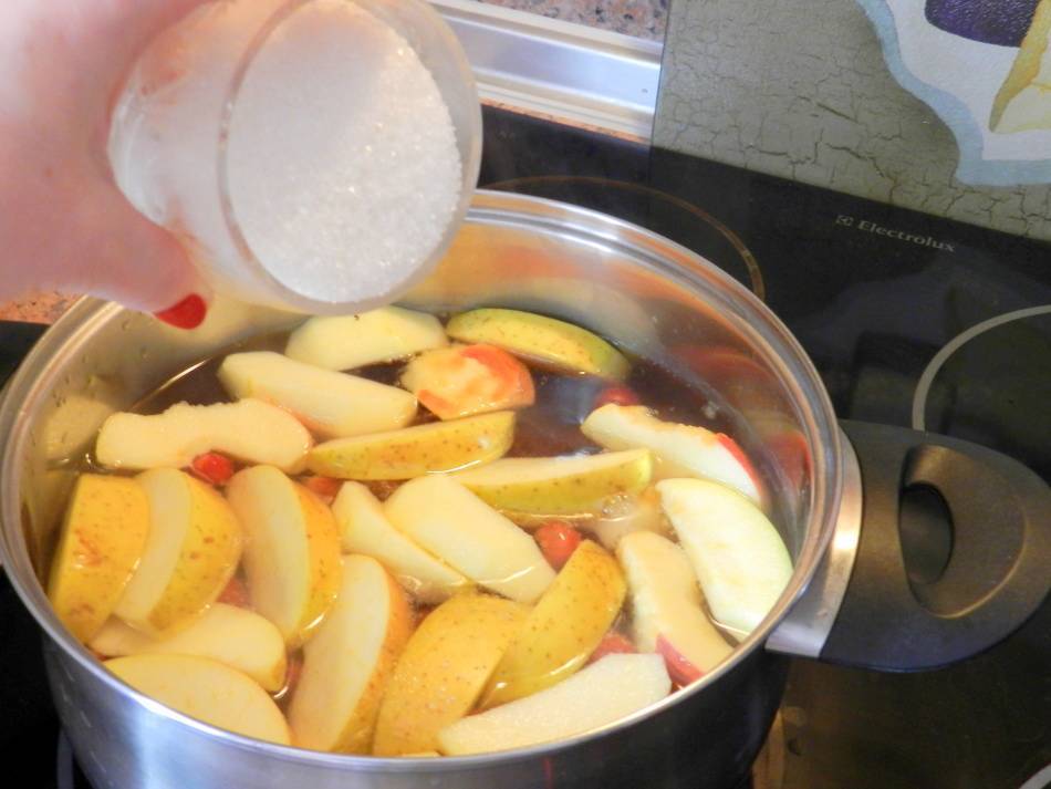 - Яблоки очищаются от кожуры и помещаются вместе с крыжовником в кастрюлю